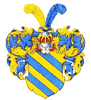 В золотом поле три диагональные голубые полосы, от правого верхнего угла к нижнему левому. На щите дворянский шлем и на нём два страусовых пера, правое золотое, левое голубое. Намёт: голубой, подложенный золотом[1].