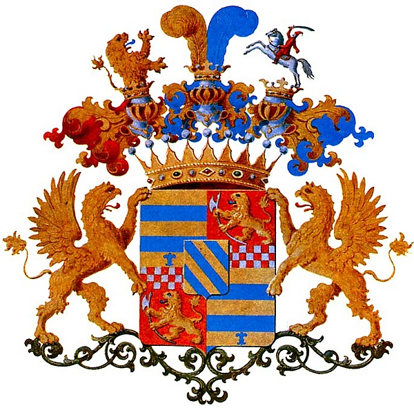 Щит увенчан графскою короною и тремя графскими коронованными шлемами. Нашлемники: первый — два страусовых пера, золотое и лазоревое; второй — возникающий золотой лев, с лазоревыми глазами и языком; третий — скачущий на серебряном коне, в червлёной одежде и с подъятым серебряным выгнутым мечом, Польский воин. Намёты: средний — лазоревый с золотом, правый — червлёный, с золотом, левый — лазоревый, с золотом. Щитодержатели: два золотых грифа, с червлёными глазами и языком.
