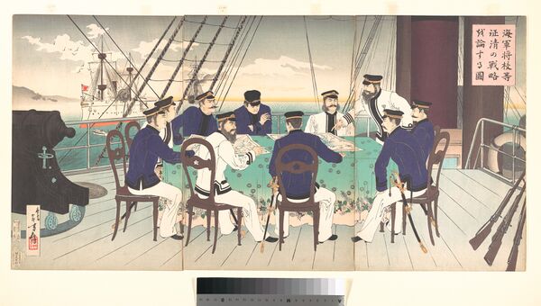 Военные гравюры являли собой ярко раскрашенные изображения кровавых сражений, подвигов и побед; японцы на них представлялись непобедимыми героями и могучими богатырями, а китайцы — жалкими трусами с гримасами ужаса на лицах, с карикатурными фигурами и смешными косичками. Японцы были полны благородства, храбрости и доблести, а китайцы дрожали от страха, унижались и плакали. Общество хотело иметь портреты своих героев, и художники выполняли этот социальный заказ, поставляя на рынок изображения самодовольных японских солдат и офицеров в величественных позах и горы трупов китайцев у их ног[7].