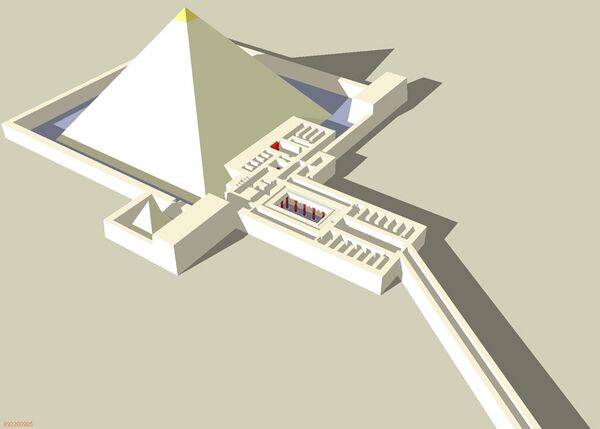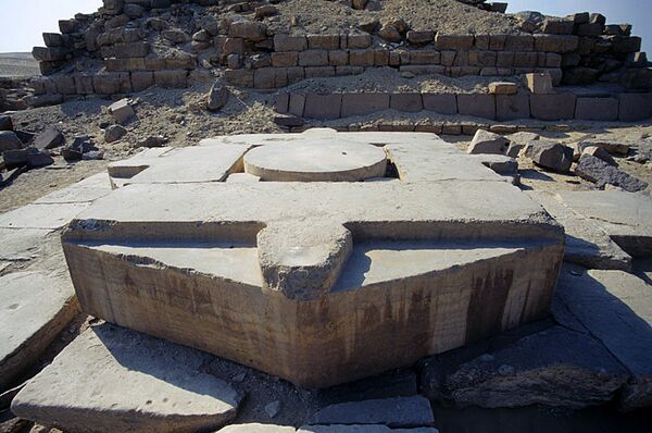Позади возвышалась главная часть сооружения, в которой археологи видят прототип обелиска. Речь идёт о памятнике, состоявшем из двух частей. Первая представляла собой цоколь в форме усечённой пирамиды высотой приблизительно 20 м, облицованный блоками полированного гранита и плитами известняка, на нём находилась вторая часть, собственно обелиск, высотой, вероятно, 36 м, также облицованный известняком. Вершина обелиска была, возможно, покрыта гранитными блоками или листами позолоченной меди. В противоположность более поздним обелискам, высеченным из единого блока, здесь мы имеем дело с конструкцией, ядро которой составляли большие известняковые блоки неправильной формы, покрытые полированными плитами. Этот впечатляющий памятник, несомненно, был символом солнечного культа. Возможно, это был первый памятник в истории человечества, в толще которого находился проход, ведущий к верхней платформе.