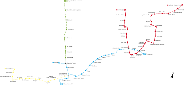 Проектами развития предусмотрено строительство подземного участка второй линии в центре Ниццы до её порта, а также третьей линии (Аэропорт — Сент-Исидор с возможностью продления до Лингостьера), которая включит в себя современную вилку второй линии. При этом вторая и третья линии не будут технологически связаны с первой, но подземный участок второй линии будет иметь две пересадочные остановки на первую (Жан Медсен и Гарибальди — Лё Шато). На совсем далёкую перспективу отложено строительство участка первой линии (Опиталь Пастёр — Ля Трините)[2].