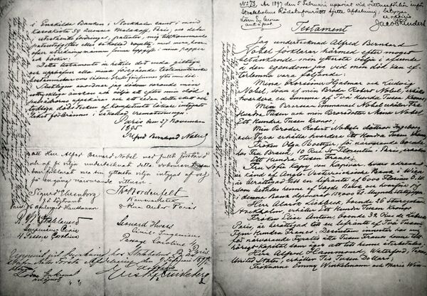 Завещание Альфреда Нобеля, составленное им 27 ноября 1895 года, было оглашено в январе 1897 года[6][7]: