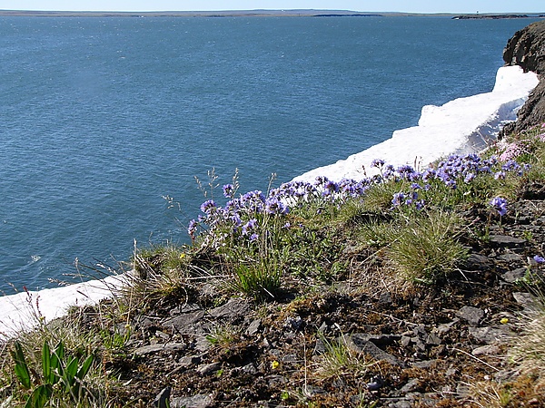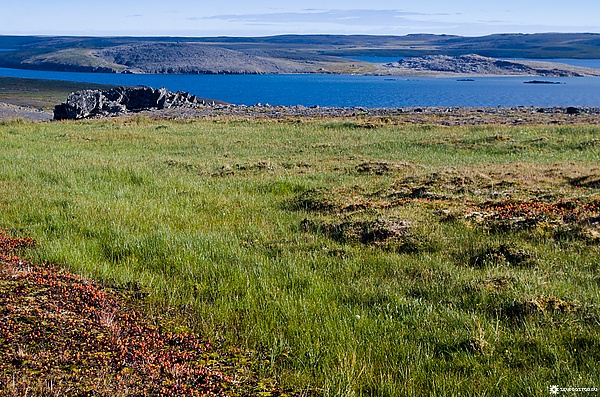 Главная роль в формировании фитоценозов принадлежит мхам и лишайникам. Последние представлены видами кладоний, высота которых не превышает 3—4 см. Значительную роль играют также арктические травянистые однолетники. Характерными для скудной флоры островов растениями являются стелющиеся виды, такие как ива ползучая (Salix polaris), камнеломка супротивнолистная (Saxifraga oppositifolia), горный лишайник и другие. Растительность в южной части составляет в большинстве карликовые берёзы, мох и низкая трава, в районах вблизи рек, озёр и заливов растёт множество грибов: грузди, опята и др.