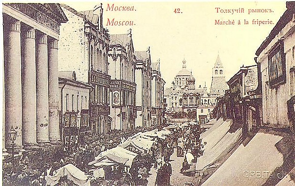 Толкучка запирала всю Старую площадь, между Ильинкой и Никольской, и часть Новой — между Ильинкой и Варваркой. По одну сторону — Китайгородская стена, по другую — ряд высоких домов, занятых торговыми помещениями[8]Писатель Владимир Гиляровский