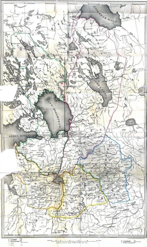 Пятины: Водская — между реками Волховом и Лугой, Обонежская — в междуречье рек Волхова и Мсты до Белого моря, Бежецкая — в междуречье рек Мсты и Мологи, Деревская — в междуречье рек Мсты и Ловати, Шелонская — от Ловати до Луги.