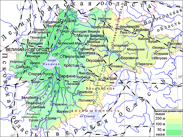 К востоку низменность повышается и замыкается Валдайским уступом, за которым расположена Валдайская возвышенность, одно из красивейших мест Восточно-Европейской равнины[12]. В озеро Ильмень впадают 52 реки, крупнейшие из них Мста, Шелонь и Ловать с Полистью, вытекает одна река — Волхов.