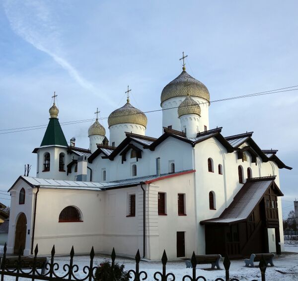 В детинце епископ Иоаким «срубил дубовую церковь Софии о тринадцати верхах», подобно киевской. С 1045 года по велению сына киевского князя Ярослава Мудрого — Владимира Ярославича, посаженного отцом княжить в Новом городе (1036—1052), стали строить каменный собор Святой Софии (1045—1050). Работали, вероятно, киевские каменщики. Этим объясняется композиционная схема, аналогичная киевской: пять нефов с хорами и лестничная башня[4].