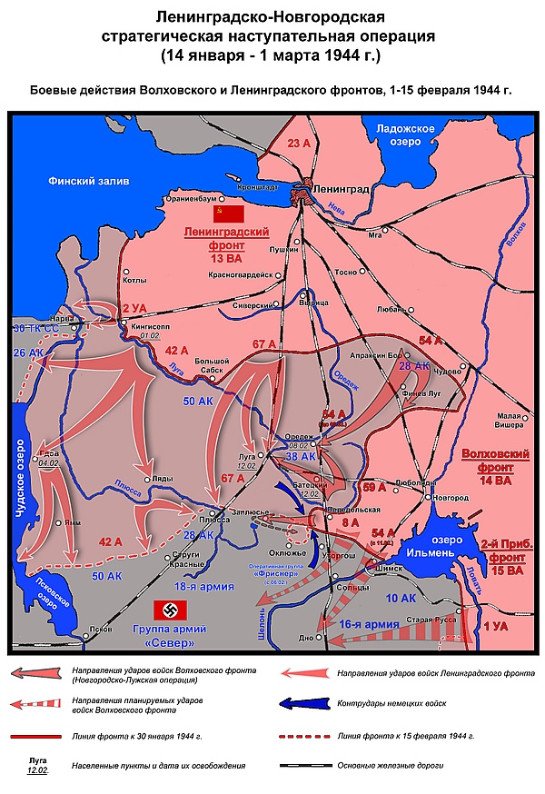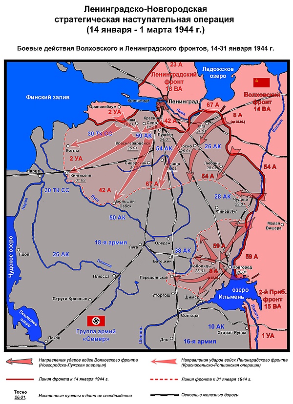 К концу января 1944 года войска Ленинградского и Волховского фронтов, отбросив немецкие войска, полностью освободили Ленинград от вражеской блокады. Однако 18-я немецкая армия не была разгромлена и продолжала оказывать ожесточённое сопротивление.