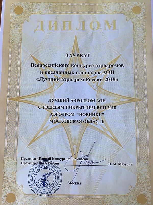 По итогам 2018 года аэродром Новинки получил диплом Всероссийского конкурса аэродромов и посадочных площадок АОН (авиации общего назначения) как лучший аэродром с твёрдой ВПП в Московской области[13].