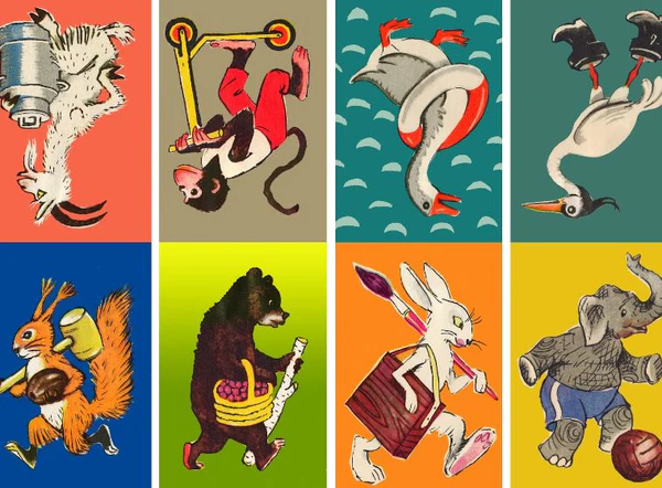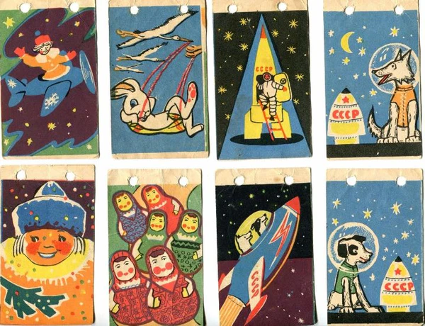 В 1960-е годы выходили наборы двусторонних флажков: на одной стороне были изображены герои сказок, на другой — реалии времени: космонавты, автомобили, военный парад на Красной площади и др.[2]