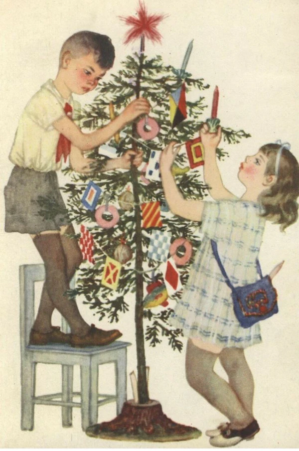 В 1936 году Наркомпрос выпустил пособие с рекомендациями по проведению детского новогоднего праздника, в том числе там описывалось, как должно выглядеть «образцовое ёлочное дерево»[3]. В качестве украшений предлагалось использовать «современные» и «своевременные» образы. На тот момент это были дирижабли, военные суда, метро, тематика Красной Армии и освоения Севера.