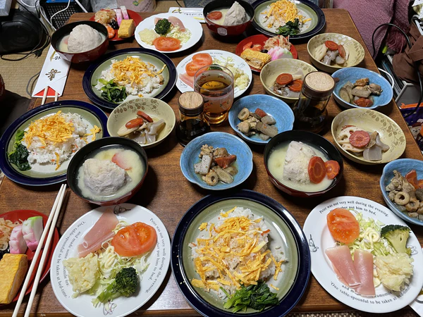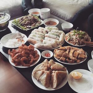 Заметное влияние на выбор блюд оказывает восточный календарь. Так, при встрече 2024 года (года Зелёного Деревянного Дракона) рекомендовалось готовить яркие и обильные столы с акцентом на мясные и рыбные блюда, свежую зелень и острые элементы, например, перец халапеньо[6]. А для встречи 2026 года (года Красной Огненной Лошади) рекомендуется обилие свежих овощей (особенно моркови), зелени, блюд из злаков и десертов на основе овсяной муки[9]. На стол также подают традиционные алкогольные и безалкогольные напитки, фрукты и различные десерты.