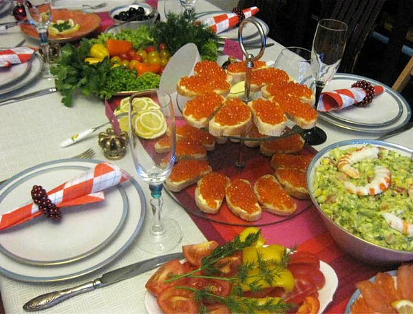 - «Полный набор» для обеспеченной семьи полностью включает в себя предыдущий «традиционный набор», а также различные мясные и рыбные деликатесы, икру лососёвых рыб, колбасу сырокопчёную, свежие овощи, орехи, мороженое, дополнительных 3 вида фруктов и алкогольных напитков[28]. В качестве символа новогоднего стола в России и странах СНГ часто присутствуют салат «оливье» и мандарины[25]. С середины 1970-х годов в этот список пополнила «сельдь под шубой»[29].