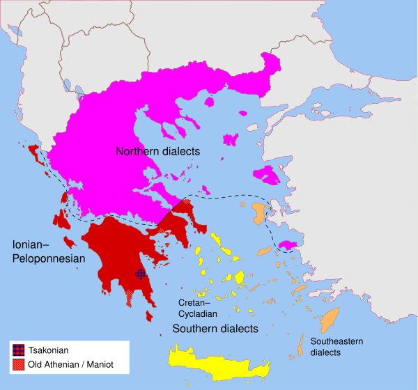 Греческий язык является независимой ветвью индоевропейских языков, а новогреческий — его независимой ветвью. Все современные (новогреческий) формы и местные диалекты греческого, кроме цаконского, являются потомками койне, которое было в употреблении в эпоху поздней античности. Таким образом, все они могут быть классифицированы как потомки аттического греческого языка — диалекта, на котором говорили жители Афин и их окрестностей в классическую эпоху. Цаконский диалект, изолированный диалект, который ныне используется лишь небольшой группой жителей Пелопоннеса, является потомком древнего дорического диалекта. Некоторые другие диалекты сохранили элементы различных древних неаттических диалектов, однако большинство ученых считают главным источником всех этих современных диалектов именно аттическое койне.