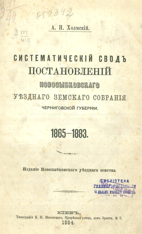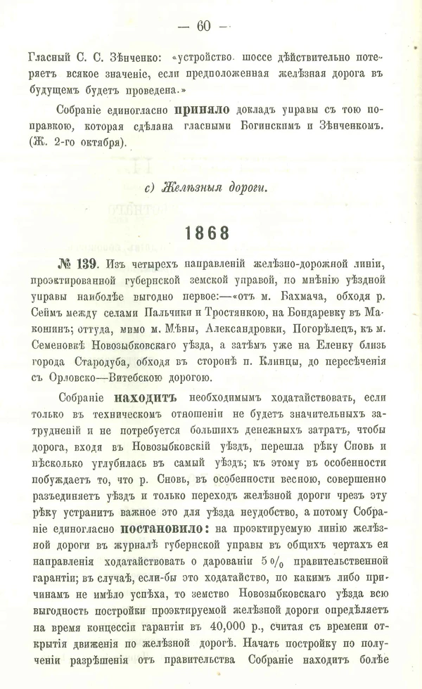 «Новозыбковский уезд один из скуднонаделенных природой уездов Черниговской губернии; земля плоха; леса быстро исчезают и исчезают для владельцев бесценно по недостатку сплавных рек и отсутствию железной дороги, но нужда развила в уезде промышленность, отхожие промыслы, фабрики, кустарное производство; торговые же пункты уезда Семеновка, Климово, Новозыбков, Злынка (хлеб, пенька, мед) пали с проведением Либаво-Роменской железной дороги и единственная надежда – проведение Брянской дороги южнее г. Новозыбкова, т.е. почти в средине уезда, как видно,рушится и только ради пользы немногих крупных землевладельцев. Земство Новозыбковского уезда ничего более не находит, как обратиться к министру внутренних дел с просьбою – защитить интересы 150 000 душ бедного крестьянского уезда и надеяться, что ходатайство это не будет оставлено без внимания».
