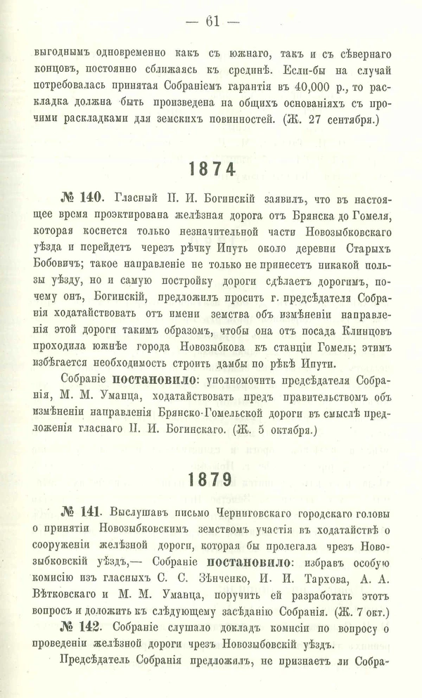 Очередная дискуссия по данному поводу состоялась в Новозыбкове в 1874 году, поскольку стало известно о проекте железной дороги от Гомеля до Брянска. Первоначально этот проект затрагивал незначительную часть Новозыбковского уезда и предполагал строительство дороги через реку Ипуть недалеко от Старых Бобович. Учитывая данное обстоятельство, гласный Богинский П.И. заявил, что «такое направление не только не принесет никакой пользы уезду, но и самую постройку дороги сделает дорогим». В связи с этим господин Богинский П.И. просил председателя уездного земского собрания Уманца М.М. ходатайствовать перед правительством об изменении направления Гомельско-Брянской дороги таким образом, «…чтобы она от пос. Клинцов проходила южнее города Новозыбкова к станции Гомель; этим избегается необходимость строить дамбы по реке Ипути».