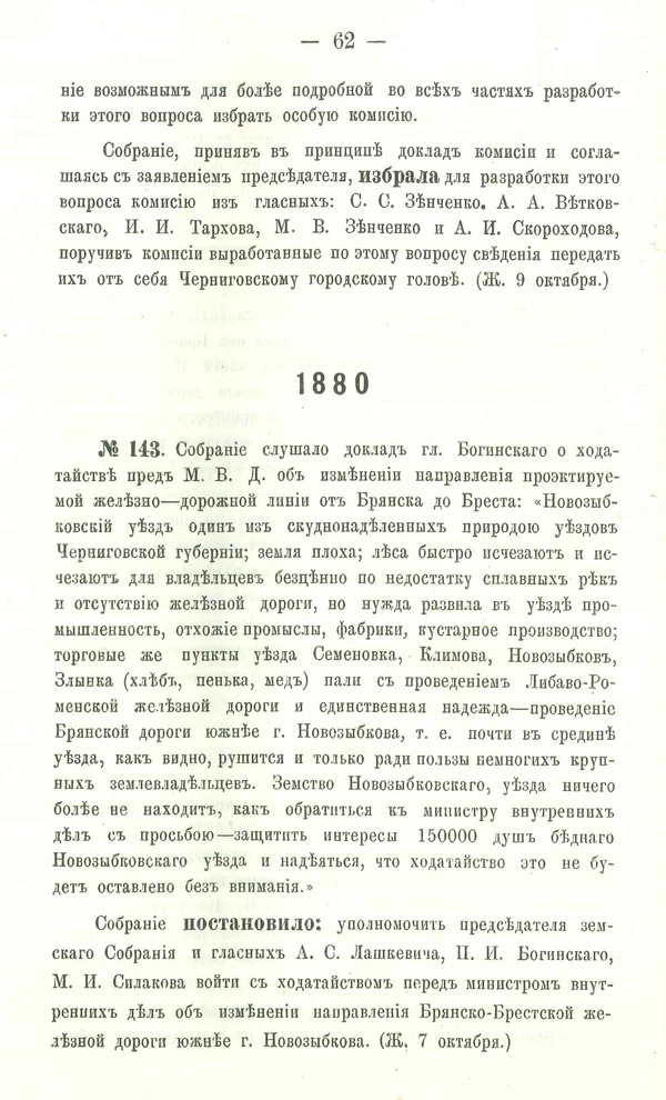 К 1879 году в Новозыбкове была создана специальная комиссия по вопросу строительства железной дороги в составе Зенченко С.С., Зенченко М.В., Ветковского А.А., Тархова И.И., Скороходова А.И. В следующем году в Новозыбковское уездное собрание поступил доклад Богинского П.И. об изменении направления проектируемой железнодорожной линии от Бреста до Брянска следующего содержания: