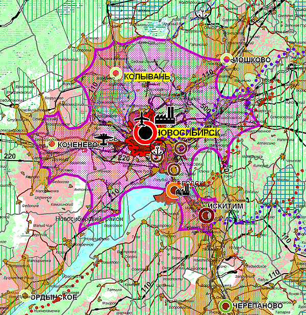 На схеме видно, что в состав Новосибирской агломерации (в границах 2-часовой доступности из Новосибирска) частично входят пригородные зоны следующих райцентров Новосибирской области: