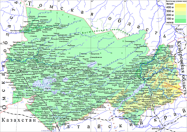 На севере граничит с Томской областью, на юго-западе — с Казахстаном, на западе — с Омской областью, на юге — с Алтайским краем, на востоке — с Кемеровской областью.