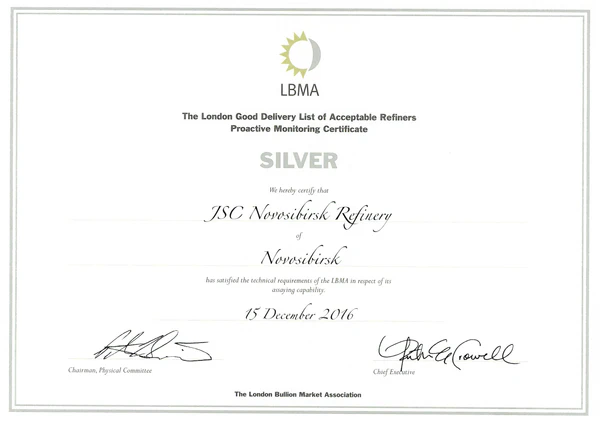 Раз в три года Лондонская ассоциация рынка драгоценных металлов (LBMA) проводит проактивный мониторинг выполнения Аналитической лабораторией анализов золота и серебра для подтверждения присвоенного заводу статуса Good Delivery[12].