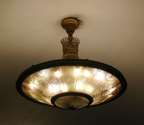 Эскалаторный зал представляет собой огромное полуциркульное шатровое помещение с полукруглым «приделом», в котором находится верхний конец эскалаторного тоннеля. Белый купол зала пересечён частыми узкими невысокими нервюрами. В вершине купола расположена лепная розетка со звездой. По подкупольному барабану идёт широкий фриз с парадным орнаментом из рельефной лепнины[14].