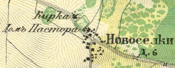 На карте Санкт-Петербургской губернии Ф. Ф. Шуберта 1834 года, упоминается деревня Новоселки и в ней Кирка и Дом Пастора[10].