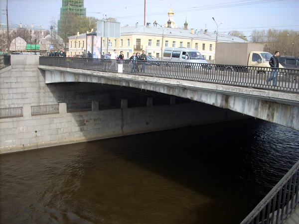 Первый мост на этом месте, деревянный, был построен в конце 1800-х годов, когда под руководством инженера Фёдора Герарда велись работы по прокладке Обводного канала. Основным назначением моста был пропуск вод самотечного Лиговского канала, уровень воды в котором был значительно выше, чем в Обводном. Мост-акведук получил название Ямского водопроводного[2]. В 1814 году строительство Обводного канала возглавил инженер Пьер-Доминик Базен. По его проекту в 1816—1821 годах здесь был построен однопролётный каменный акведук. Отверстие моста длиной 25,6 м перекрывалось очень пологим гранитным сводом с деревянными водопроводными руслами для пропуска Лиговского канала[3]. Мост был однопролётным арочным каменным, с четырьмя спускающимися к воде гранитными лестницами, гранитными тротуарами, ограждёнными чугунными перилами на металлических кронштейнах[4]. Несмотря на последующие ремонты, архитектурный облик моста сохранялся в своём первоначальном виде[5].
