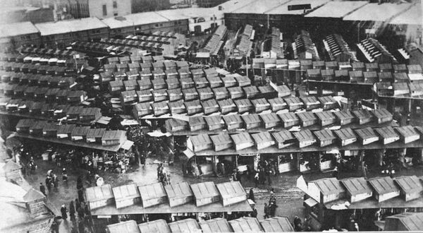 «Бараки расположены по отделам: галантерея, обувь, кожа, одежда, москательный, щепной, скобяной, шапочный, стеклянный, мебель, меха, мануфактура, мясной, рыбный, мучной, письменные принадлежности, табак и пока только две книжных лавки букинистов и ни одной антикварной»[3].