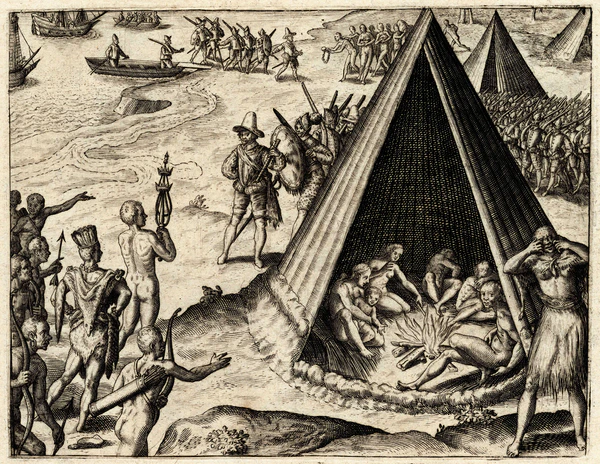 При нашем отъезде отсюда наш генерал воздвиг памятник нашему пребыванию там, а также праву и титулу Ее Величества на то же самое; а именно табличка, прибитая к прекрасному большому столбу, на которой было выгравировано имя Ее Величества, день и год нашего прибытия туда, с безвозмездной передачей провинции и народа в руки Ее Величества вместе с портретом и гербом Ее Высочества, монетой в шесть пенсов ходовых английских денег, под табличкой, под которой также было написано имя нашего генерала[99]
