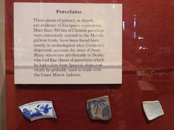Артефактические доказательства появились, когда около сотни предметов китайского экспортного фарфора XVI века были найдены в окрестностях бухты Дрейка, которая, по словам Кларенса Шангроу из Музея азиатского искусства в Сан-Франциско и археолога Эдварда фон дер Портена «должна быть справедливо приписывается визиту Фрэнсиса Дрейка „Золотой лани“ в 1579 году»[70][71]. Эти керамические образцы, найденные в Пойнт-Рейес, являются самыми ранними датируемыми археологическими образцами китайского фарфора, перевозимыми через Тихий океан на манильских галеонах[70]. Артефакты были обнаружены четырьмя различными агентствами, начиная с Калифорнийского университета, Гильдия навигаторов Дрейка, затем младший колледж Санта-Роза и, наконец, Государственный колледж Сан-Франциско[72]. Эти осколки фарфора — остатки фарфоровой посуды, которую Дрейк похитил с испанского корабля с сокровищами в Тихом океане. Фарфоровые изделия, разгруженные во время крена и брошенные, когда Дрейк отплыл из Пойнт-Рейес, были самыми тяжелыми предметами неизвестной ценности, которые он нес[73].