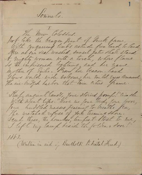 Этот сонет был написан как пожертвование для аукциона художественных и литературных произведений[2], проведенного «Выставкой Фонда художественного займа в помощь фонду пьедестала Бартольди для Статуи Свободы»[3]. Фонд был создан с целью сбора средств на строительство пьедестала. Когда устроитель аукциона Уильям Максвелл Эвартс предложил Эмме Лазарус участвовать, она сначала отказывалась, говоря, что не может сочинять стихи по заказу. Однако писательница Констанция Кэри Харрисон убедила её взяться за работу, сказав, что статуя будет иметь большое значение для иммигрантов, прибывающих в гавань[4].