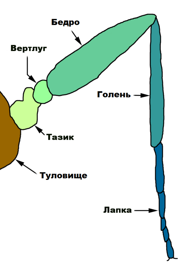 Как и у остальных членистоногих, ноги насекомых состоят из стандартного набора члеников, каждый из которых имеет свое название и функцию. У насекомых выделяют 5 частей ноги: