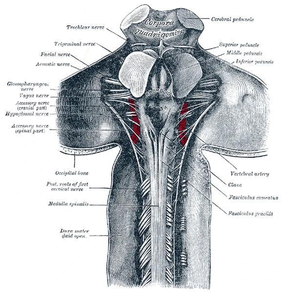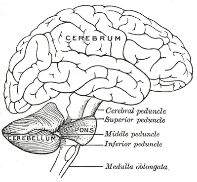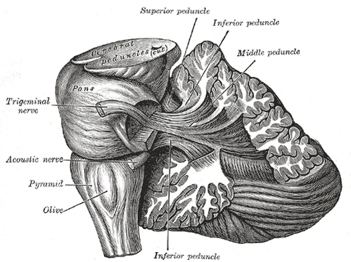 Между ножками мозга также выходит глазодвигательный нерв, а блоковый нерв огибает наружную поверхность ножек мозга. Глазодвигательный нерв ответственен за миоз (сужение зрачка, парасимпатическую реакцию) и некоторые виды движений глаз[1].