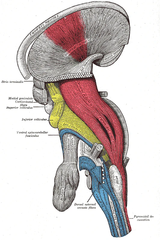 Как в покрышке среднего мозга (или самой верхней части ножек мозга, согласно одному из определений этого термина), так и в основании ножек мозга (в их самой нижней части), проходят волокна кортикоспинального пути, как восходящие, так и нисходящие. Восходящие пути от спинного мозга они проходят через основания ножек мозга или через покрышку среднего мозга, затем через таламус или внутреннюю капсулу, и затем в соматосенсорные и висцеросенсорные области коры больших полушарий головного мозга. Нисходящие волокна, идущие в обратном направлении, от коры больших полушарий к спинному мозгу, также проходят на своём пути через ножки мозга[1].