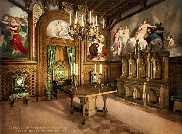 В интерьере замка главную роль играют иллюстрации к операм Вагнера и старинным германским легендам. Лебединый мотив — то, чем пронизана вся архитектура и художественные украшения замка. Лебедь — геральдическая птица старинного рода графов Швангау. Преемником этого рода считал себя отец Людвига, Максимилиан II Баварский.