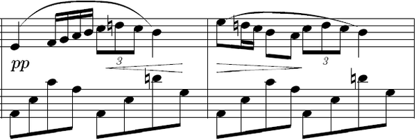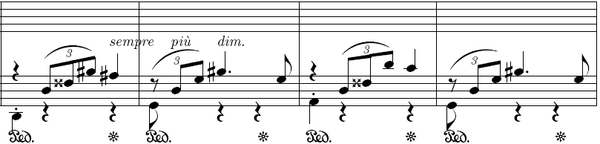 4, начинающийся в такте 33, напоминает часть скерцандо третьей части Второго фортепианного концерта, начинающуюся в такте 145, в которой левая и правая рука играют с разницей в октаву. В тактах с 58 по 61 есть 4 особые ритмические группы, все из них звучат в ми мажоре. Произведение заканчивается на ppp с высоким и низким C ♯.