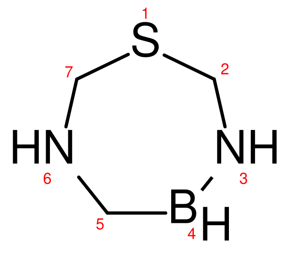 Локанты используются для обозначения взаимного расположения гетероатомов в цикле. Для расстановки локантов старшему гетероатому (стоящему выше в таблице приставок) присваивают наименьший номер, а атомы цикла нумеруют так, чтобы получить наименьший набор локантов. Затем локанты перечисляют перед приставками в порядке следования приставок[3].
