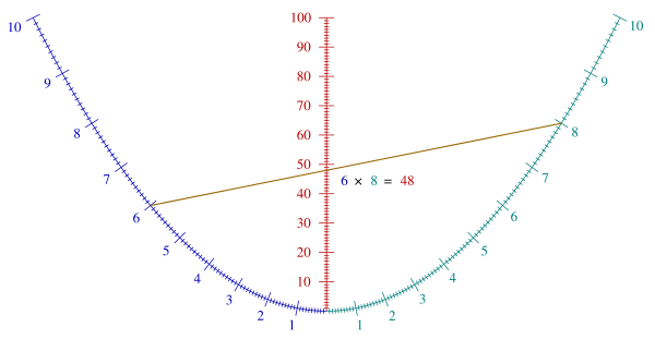 A и B отмеряются на горизонтальной и вертикальной шкалах, а результат считывается с диагональной шкалы. Будучи пропорциональной среднему гармоническому чисел A и B, формула имеет несколько приложений. Например, сопротивление соединённых параллельно проводников в электрических сетях и уравнение тонких линз в оптике.