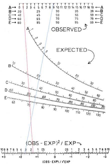 Шкала сверху соответствует пяти различным интервалам наблюдаемых значений — A, B, C, D и E. Наблюдаемое значение ищется среди этих значений и выбирается метка над ним. Затем на соответствующих кривых шкалах выбирается ожидаемое значение. Например, для наблюдаемого значения 9 выбирается метка над числом 9 в интервале A, а кривая шкала A используется для ожидаемого значения. Для наблюдаемого значения 81 будет использована метка над 81 в интервале E и кривая шкала E для ожидаемого значения. Это позволяет несколько номограмм вместить в одну диаграмму.