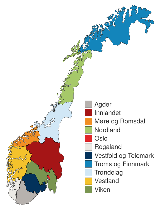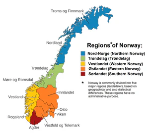 Остальные части (первоначально от Йэрена) в древние времена назывались «Nordafjeldske Norge», южные части которой (начиная от города) в настоящее время называются «Vestafjeldske Norge». Это разделение страны основано на естественных условиях ландшафта, подобное дробление страны на части чрезвычайно высокими и малодоступными горными массами обусловливает большое разнообразие в характере и обычаях населения.