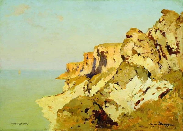 Картина представляет собой пейзаж, построенный на диагональном соотношении суши и водной поверхности. Правая часть полотна занята по диагонали массивным скалистым берегом. В левой части изображена спокойная гладь светло-голубого моря, уходящая вглубь до линии горизонта; на этом фоне отчетливо видна парусная лодка. Небо выполнено в голубой гамме, плавно переходящей к горизонту в серо-лиловую дымку.