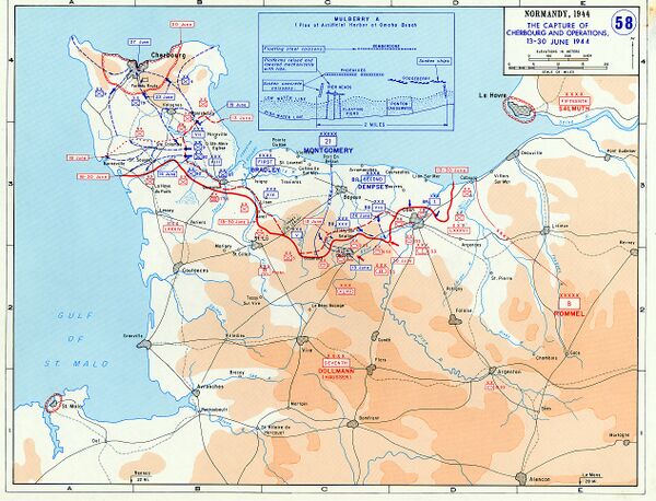 18 июня войска 7-го корпуса 1-й американской армии, наступая к западному побережью полуострова Котантен, отрезали и изолировали немецкие части на полуострове. 29 июня союзники овладели глубоководным портом Шербур, и тем самым улучшили своё снабжение. До этого союзники не контролировали ни одного крупного порта, и в бухте Сены действовали «искусственные гавани» («Mulberry»), через которые происходило всё снабжение войск. Они были очень уязвимы из-за неустойчивой погоды, и командование союзников понимало, что им нужен глубоководный порт. Взятие Шербура ускорило прибытие подкреплений. Пропускная способность этого порта составляла 15 000 тонн в сутки.