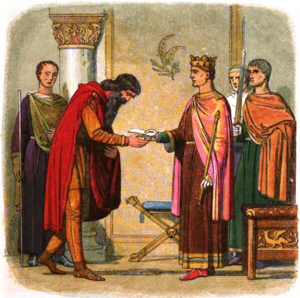 Генрих, король Англии, герцог Нормандии и граф Анжу, всех своих вассалов, англичан, нормандцев, валлийцев и шотландцев, а также всех остальных, находящихся под его владычеством, приветствует. Когда эти письма попадут в ваши руки, знайте, что мы приняли в лоно нашей милости и благоволения. Посему, всякий в наших обширных владениях должен быть готов оказать помощь в восстановлении этого князя как нашего вассала и подданного. Пусть таковой человек знает, что мы предоставляем ему наше право и милость для указанного предприятия[2].