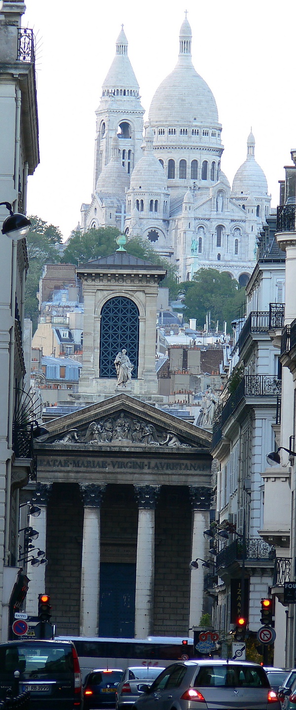Церковь имеет форму классической базилики, без поперечного трансепта, в подражание базиликам Рима. Фасад церкви состоит из большого четырёхколонного портика и треугольного фронтона над ним. Под фронтоном надпись на латыни «Sanctae Mariae Virgini Lauretanae» (Святая Дева Мария Лоретанская). В самом фронтоне находится скульптурная композиция «Поклонение ангелов Деве с Младенцем», скульптор Шарль-Франсуа Лебёф. На крыше фронтона — три статуи, символизирующие три главные христианские добродетели: веру, надежду и любовь.