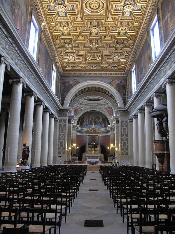 В интерьере церкви выделяется живописное изображение «Коронование Девы Марии» над апсидой, авторства Франсуа Эдуара Пико. Сюжет картины над хорами посвящён легенде о переносе дома Девы Марии из Назарета в Лорето ангелами. Золочёный потолок церкви — прямое подражание потолку базилики Санта-Мария-Маджоре. Четыре часовни, окружающие неф, посвящены четырём христианским таинствам: крещению, евхаристии, браку и елеопомазанию. Около колонн главного нефа — несколько статуй Девы Марии различных мастеров.