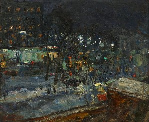 На полотне представлен ночной городской пейзаж с силуэтами деревьев и домов. Улица освещена горящими огнями фонарей и яркой иллюминацией, что подчёркивает атмосферу ночи и создает выразительный световой акцент в композиции.