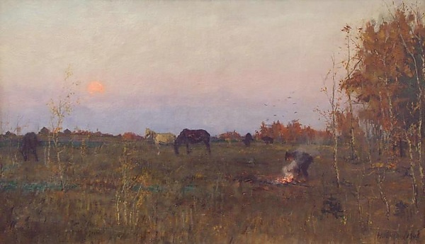 На полотне представлен ночной пейзаж: широкое, вытянутое по горизонтали осеннее поле. В центре композиции изображены две лошади, а правее, у горящего костра, находится фигура человека. На заднем плане, у пожелтевшего леса, видны ещё несколько лошадей. На тёмном небе выделяется яркий месяц, подчёркивающий атмосферу ночи.