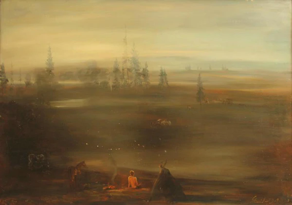 На переднем плане картины у небольшого костра и стога сена спиной к зрителю сидит подросток, наблюдающий за пасущимися поодаль лошадьми. Пространство окутано предрассветным туманом, который мягко обволакивает редкие ели и поля, по которым мирно гуляют животные. Лёгкая дымка объединяет даль и небо, где первые солнечные лучи окрашивают облака в бледно-розовые оттенки.