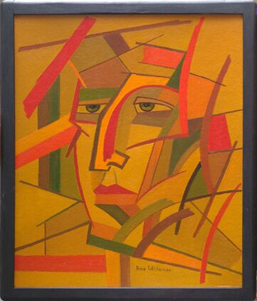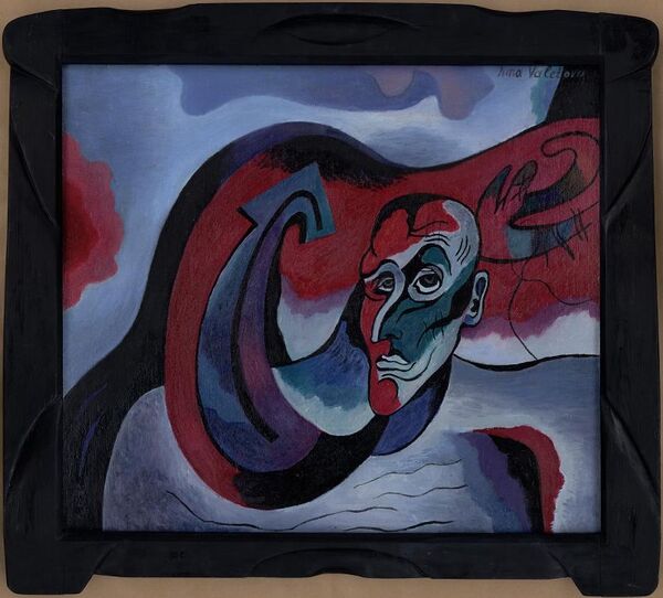Композиция выполнена в линейном стиле: в центре размещена асимметричная трёхэтажная башня с тремя окнами и арочным входом, к которому ведут ступени, а по бокам расположены полукруглые архитектурные элементы. В нижней части изображения за каменной стеной выглядывает человеческая фигура, рядом с ней — кузнечик, а две собаки стремительно выбегают за пределы плоскости картины. В правом верхнем углу изображены ствол старого дерева, облако и фрагментированная человеческая фигура, разделённая пополам многоугольником. Колорит построен на сочетании чёрного, красного и синего цветов.