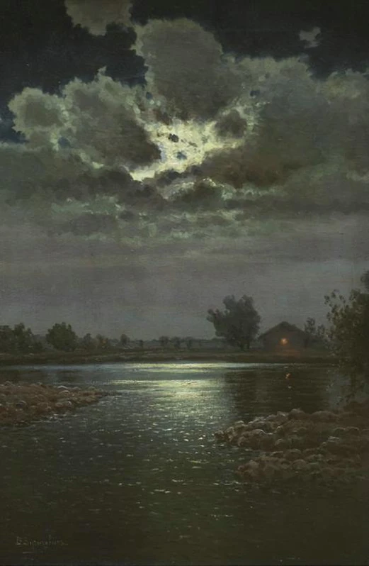 На полотне представлен летний пейзаж под высоким тёмно-синим небом с облаками, скрывающими луну. На первом плане между берегами уходящей вглубь реки перекинут деревянный мостик, на втором плане расположен деревенский дом с горящим красным светом в оконном проёме. Дом обрамляет группы деревьев по обеим сторонам полотна. В тёмно-синей воде реки отражаются свет луны и горящего окна. В левом нижнем углу картины находится подпись «ввучичевичъ».